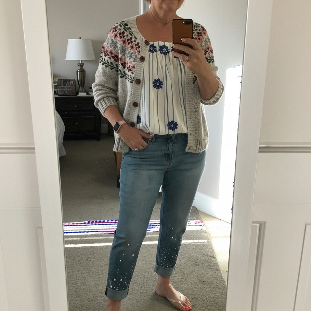 „Uwielbiam połączenie kolorów w tym kardiganie. Wygląda świetnie zarówno do spodni, jak i do sukienki. Jest lekki, ale wystarczająco ciepły, żeby zastąpić kurtkę w chłodniejsze dni.”